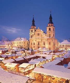 Der Ludwigsburger Barock-Weihnachtsmarkt verzaubert: Ein goldener Schimmer liegt über dem von Arkaden umsäumten Marktplatz und den liebevoll dekorierten Ständen. Lichtertore aus tausenden kleinen Leuchten spannen sich über den Dächern der weihnachtlichen Buden, Engel breiten anmutig ihre großen glitzernden Flügel aus. Die zwei barocken Kirchen erstrahlen im festlichen Glanz.