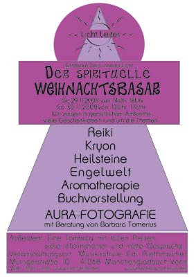 An zwei Tagen zeigen sie ihr Angebot rund um das Körperliche-Geistige und Seelische Wohlbefinden. Themenschwerpunkte sind Reiki, Kryon, Aromatherapie (Duftölmischungen, Ätherische Öle, Räucherstoffe), Heilsteine, Engel, Runen, Meditation, Energiearbeit und viele schöne spirituelle Geschenkartikel unterschiedlichster Art.