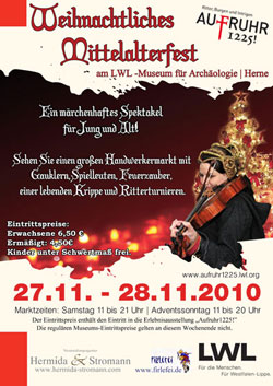 Die Ritter putzen ihre Rüstungen, der Schmied bringt schon das Eisen zum Glühen, der Palisadenzaun wird errichtet - die Vorbereitungen für das große Abschlussfest der Ausstellung „Aufruhr 1225“ rund um das LWL-Museum für Archäologie in Herne laufen an: Am ersten Adventwochenende (27./28.11.) wird das Außengelände des LWL-Museums in eine mittelalterliche Weihnachtsatmosphäre getaucht sein. Die Besucher erwartet ein weihnachtlicher Handwerkermarkt, Feuerzauber und ein buntes Bühnenprogramm.