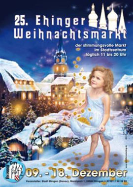 Am Freitag, dem 9. Dezember 2011, öffnet um 18:00 Uhr einer der schönsten Weihnachtsmärkte der Region in Ehingen an der Donau, 25 km westlich von Ulm gelegen, seine Pforten. Mehr als zwei Dutzend liebevoll geschmückte Verkaufshäuschen schmiegen sich auf dem Ehinger Marktplatz eng anliegend um den Marktbrunnen und den großen Tannenbaum