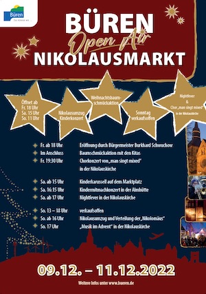 Der Nikolausmarkt in Büren öffnet am zweiten Adventwochenende, vom 06. bis 08. Dezember 2019, an der Nikolauskirche und im Rathausinnenhof.