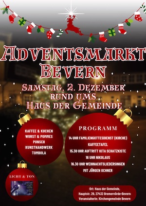 Der Adventsmarkt der evangelisch-lutherischen Kirchengemeinde Bevern bei Bremervörde beginnt am ersten Adventsamstag in ungeraden Jahren, dem , um 14:00 Uhr mit dem familienfreundlichen Gottesdienst in der Kirche, gefolgt vom bunten Markttreiben am Haus der Gemeinde in Bremervörde-Bevern.
