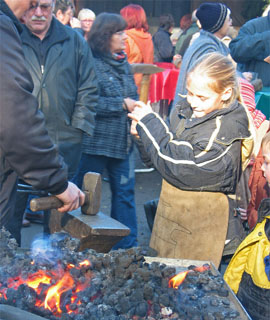 Im Pferdestall erwartet wieder die Märchentante die Kinder zu vorweihnachtlichen Geschichten bei Kerzenschein. Zahlreiche Stände mit schönem Kunsthandwerk und Weihnachtsschmuck finden sich hier ebenso wie in der Scheune und unter den großen Hofeichen. Eine Perlenhexe betört mit zauberhaftem Glasperlenschmuck, eine Seifensiederin breitet die vielfarbigen und duftenden Schätze aus ihrer traditionellen Handwerkstatt aus. Und der Schmied auf dem Hofplatz an seiner lodernden Esse lässt neugierige Kinder gerne auch mal den Hammer schwingen.