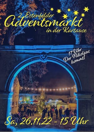 Der Estenfelder Adventsmarkt öffnet am ersten Adventsamstag, dem , von 15:00 Uhr in der ehemaligen Kartause in Estenfeld.