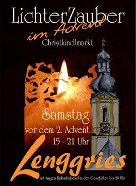 Der Lichterzauber in Lenggries öffnet traditionell am zweiten Adventsamstag, dem , von 15:00 bis 21:00 Uhr in der Marktstraße, Bahnhofstraße, und Schützenstraße Lenggries.