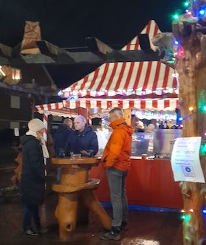 Freuen Sie sich auf original Nürnberger Glühwein, Bratwurst, Lebkuchen und weitere Fränkische Spezialitäten an dem rot-weißen Weihnachtszelt.