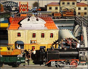 Als besondere Attraktion zeigen wir eine große Modelleisenbahnanlage (mit Uhrwerk- bzw. Elektro-Lokomotivantrieb) der Spur 0, fast ausschließlich mit „Märklin“- und „Bing“-Artikeln aus der Epoche 1900-1935. Während viele Eisenbahnanlagen, die zur Adventszeit vorgeführt werden, aus späterer Zeit stammen, ist die des Kreismuseums von ganz besonderem historischem Reiz. Das gilt nicht nur für den seltenen Spur-Null-Schienenzeppelin oder die verschiedenen Bahnhöfe.