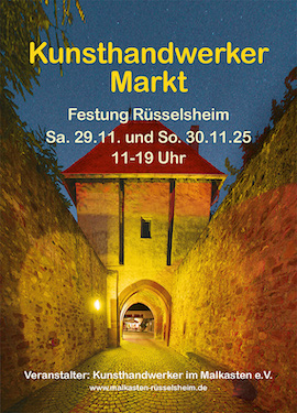 Der vorweihnachtliche Kunsthandwerkermarkt des Vereins Malkasten öffnet traditionell am ersten Adventwochenende, dem und , samstags und sonntags von 11:00 bis 19:00 Uhr in der Rüsselsheimer Festung.
