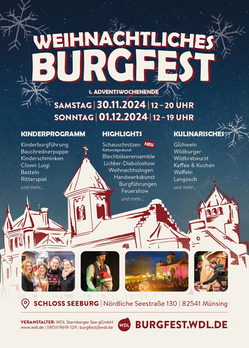 Erleben Sie einen ganz besonderen Weihnachtsmarkt am Starnberger See für die ganze Familie. Im Dezember veranstaltet das christliche Kinder- und Jugendwerk WDL in der Seeburg wieder sein weihnachtliches Burgfest mit Glühwein, Wildbratwurst und Hirschwildburger vom Grill, Kinderpunsch, Kaffee und Kuchen, Langosch, Waffeln und vielen weiteren Leckereien. Ein Blechbläserensemble und gemeinsames Weihnachtsliedersingen in der Burgkapelle bringen Sie in vorweihnachtliche Stimmung. Die kleinen Besucher erwartet ein abwechslungsreiches Angebot mit den pädagogischen WDL-Mitarbeitern in der Wichtelwerkstatt. Alle Kinder können an einer Kinderburgführung, an einem interaktiven Abenteuer-Ritterspiel oder Mal- und Bastelaktionen teilnehmen, sich schminken lassen, Kleinkunst und Akrobatik bestaunen und werden von Clown Luigi und der Bauchrednerpuppe Kalle zum Lachen gebracht. Währenddessen haben Sie die Möglichkeit an einer ausführlichen Burgführung teilzunehmen oder Schauschnitzen mit Kettensäge und die in den Sand gemalte Weihnachtsgeschichte zu bestaunen. Auf dem Gelände der Seeburg finden Sie kreative Handarbeiten aus der Region, z.B. Filzartikel und Seifen sowie dekorativ verpackte Leckereien wie Imkerhonig, Gewürze und Liköre. Das Café in der Seeburg lädt zum Verweilen ein und mit Einbruch der Dunkelheit erleben Sie faszinierende Feuer- und Lichter-Diaboloshows. Informationen zu den Programmpunkten, Uhrzeiten und Parkmöglichkeiten finden sie unter www.burgfest.wdl.de