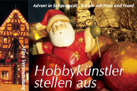 Der Seligenstädter Hobbykünstlermarkt öffnet traditionell am ersten Adventwochenende, dem und , samstags von 11:00 bis 19:00 Uhr und sonntags von 11:00 bis 18:00 Uhr im Riesen-Saal in Seligenstadt.