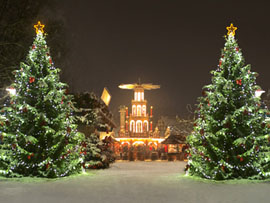 Große, 8 – 12 m hohe Tannenbäume festlich dekoriert und illuminiert sorgen für ein einmaliges Weihnachtsflair. Millionen Lichter in den Bäumen und in den aufgestellten Tannenbäumen.