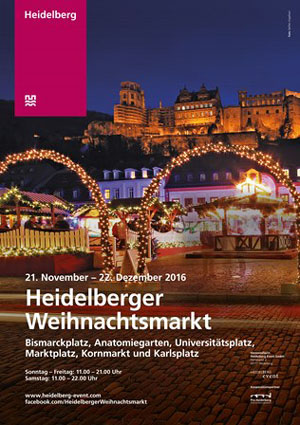 Der Heidelberger Weihnachtsmarkt öffnet vom bis sonntags bis freitags von 11:00 bis 21:00 Uhr, samstags von 11:00 bis 22:00 Uhr mit über 140 Ständen auf sechs verschiedenen Plätzen Heidelbergs.