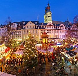 Durch die festlich geschmückte Altstadt schlendern Sie ganz entspannt von einem Lieblingsplatz zum nächsten. Wo Sie verweilen, entscheiden Sie nach Lust und Laune. Ein besonderer Anblick sind die bunt erleuchteten Dachgauben des barocken Rathauses – gemeinsam bilden sie den größten Adventskalender der Stadt. Vor der stimmungsvollen Altstadtkulisse schmeckt der erste Glühwein gleich noch einmal so gut! Wie wäre es dazu mit einem mit Zucker überzogenen Baumstriezel, deftigen Koblenzer „Krebbelcher“ (Reibekuchen) oder internationalen Köstlichkeiten?