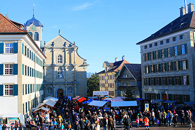 Der Landsgemeindeplatz im Zentrum des Dorfes Trogen im Appenzellerland Schweiz ist seit 1986 am zweiten Adventssamstag mit über 50 Marktständen Plattform für den Verkauf von Produkten ausschließlich aus sozialen Institutionen für Menschen mit Behinderung.