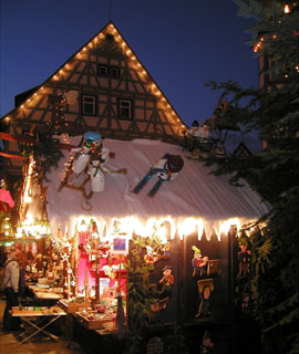 In den Waiblinger Weihnachtskellern findet man alles was zur Adventszeit gehört: Künstlerisches und Handgefertigtes bei der ART-verwandt im Schlosskeller mit insgesamt rund 40 Teilnehmern, eine Adventskalenderausstellung aus privater Sammlung mit rund 400 Exemplaren im Kameralamtskeller und noch einiges mehr. Rund um den von Fachwerkgiebeln gesäumten Marktplatz in der historischen Altstadt sind vorwiegend die lukullischen Spezialitäten angesiedelt, Flammkuchen, Burger im Laugen, pikante Suppen und Eintöpfe und natürlich die Original Thüringer Bratwurst. Duftender Winzerglühwein in der Winterweinlaube, Jagertee oder Punsch, für jeden Geschmack das Passende.